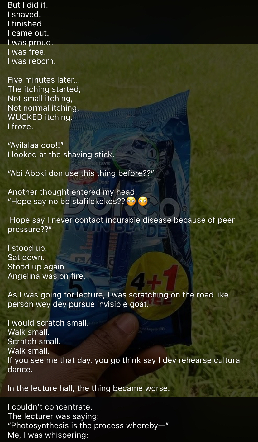 A Nigerian lady, Okih Bukola, has shared a humorous story about her first experience shaving her pubic hair in university.