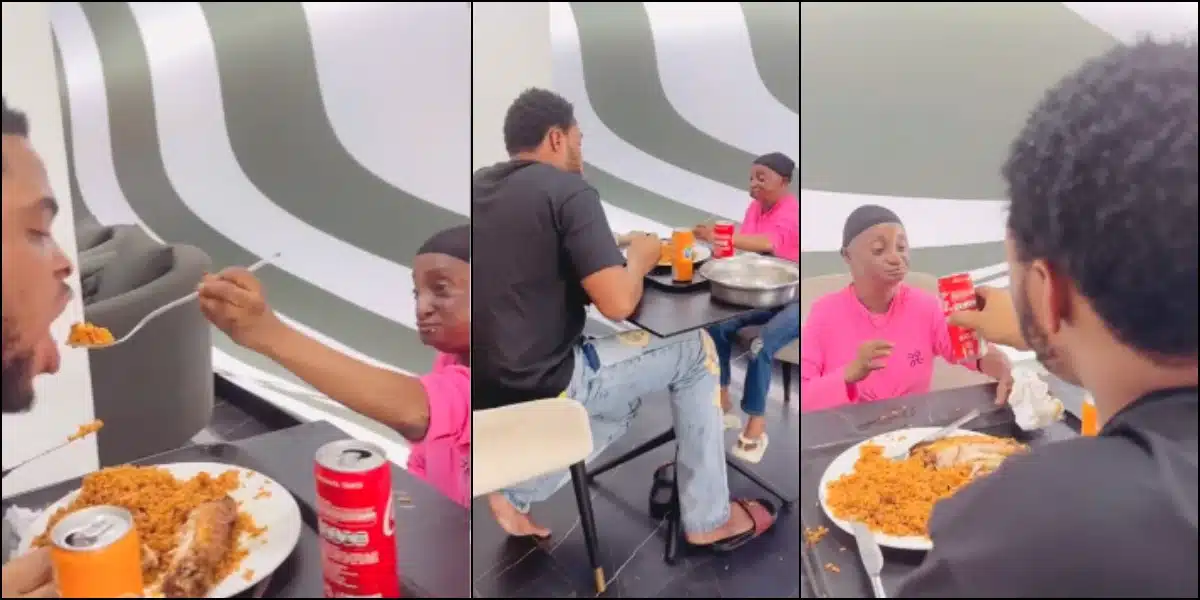 They took turns feeding each other. Ramota feed the man a spoon full or rice and the man in turn gave her a can of coke.