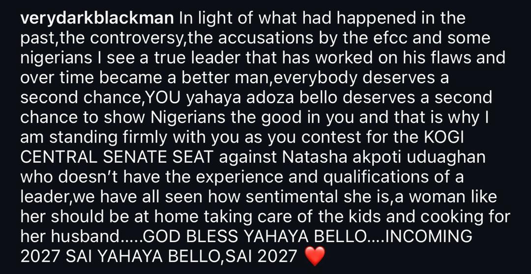 Social media commentator, VeryDarkMan has publicly expressed his support for Yahaya Bello as the former Kogi State Governor prepares to contest for the Kogi Central Senate seat against Senator Natasha Akpoti.