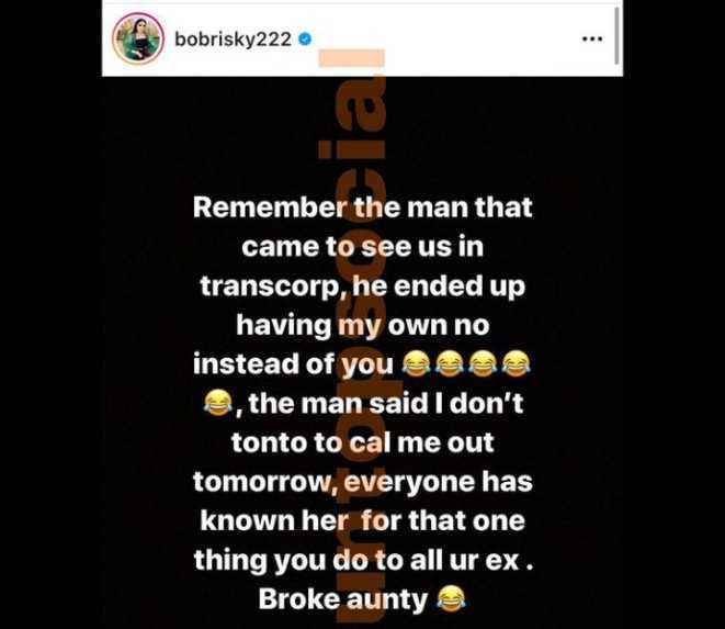 “Remember the man that came to see us at Transcorp, he ended up having my own number instead of you. The man said I don’t want Tonto to call me out tomorrow. Everyone has known her for that one thing you do to all your ex. Broke aunty”.