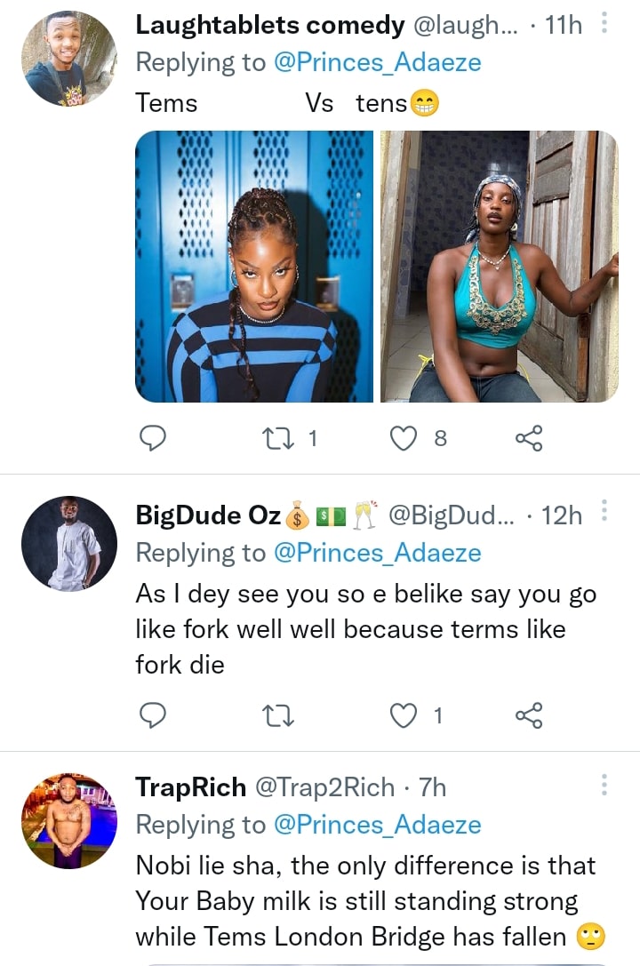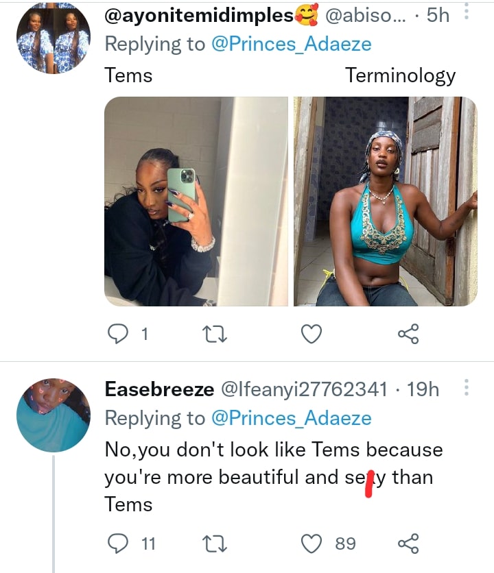 “Everyone keep saying I look like tems but am the only one that is not seeing it 😔,” she wrote as she shared photos of herself so netizens can make comparisons.