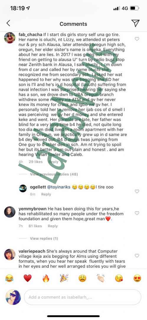 If I start dis girls story self una go tire. Her name is oluchi, nt Lizzy, we attended st peters nur & pry sch Alausa, later attended oregun high sch, oregun, her elder sister’s name is onyeka. Everything about her are lies. In 2017 I was going out with my friend on getting to alausa U” turn by radio bust stop near Zenith bank in Alausa, I saw oluchi , I cm down from d car and called her by name oluchi she recognized me from secondary sch, I asked her wat happened to her why was she begging she SD her son is I’ll and he’s in d hospital (lasuth) suffering from naval infection I was surprised hearing her saying she has a son, we drove dwn to UBA oregun branch withdrew some money via ATM and gv her never knew its money for crack and Igbo we gv her. I personally told her to remove her ijab cos of d smell I was perceiving we gv her d money and she entered keke and went. Her parents are late, her father was blind for a very long time b4 he died, not quite long too dia mum died lived In a room apartment with her family in Oregun, we practically grew up in d same are b4 dey moved out. B4 d drugs twas jumping from One guy to d other den in sch. Am nt trying to spoil her but its better u cm out plain and honest . and am hearing Vivian fowler and Caleb.