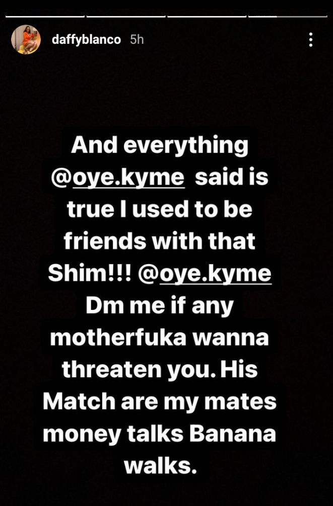 “Everything Oye Kyme said is true. I used to be friends with that shim. Oye DM me if any mudafuka want to threaten you. His match are my mates. Money talks banana walks”, she wrote.