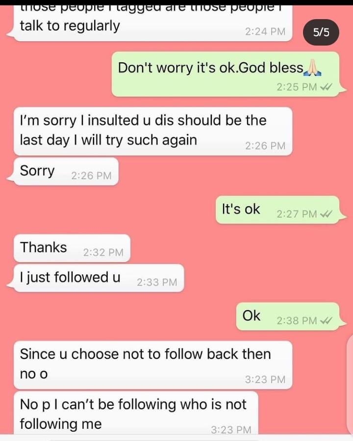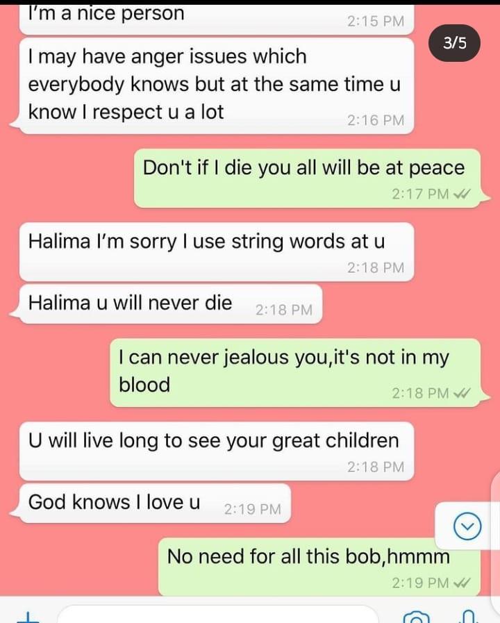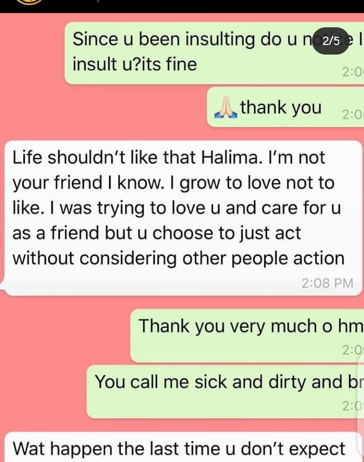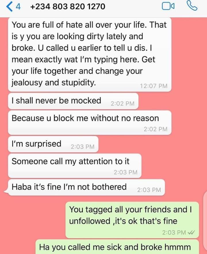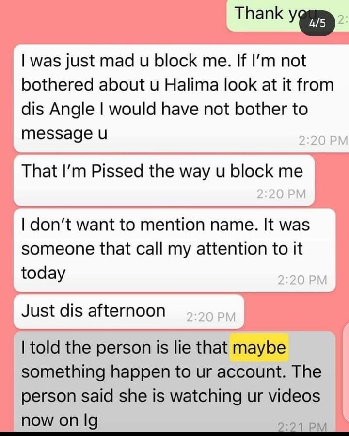 Halima posted screenshots of conversations had since 2019. In the conversation that ensued between her and alleged, Bobrisky. The crossdresser had accused her of blocking him on Instagram.