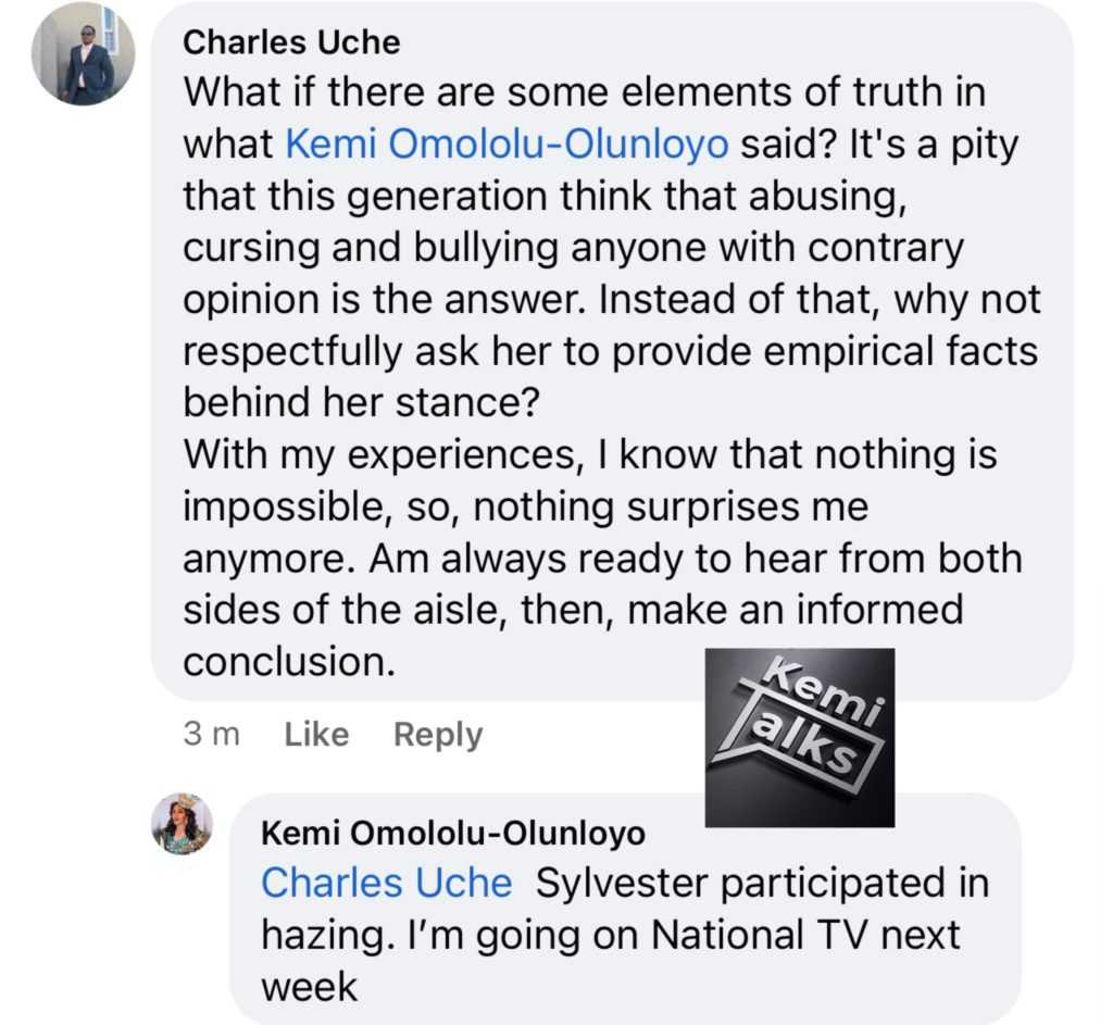 “Evidence is clear” – Kemi Olunloyo says as she shares screenshots, insists Sylvester Oromoni was not bullied (Screenshots)