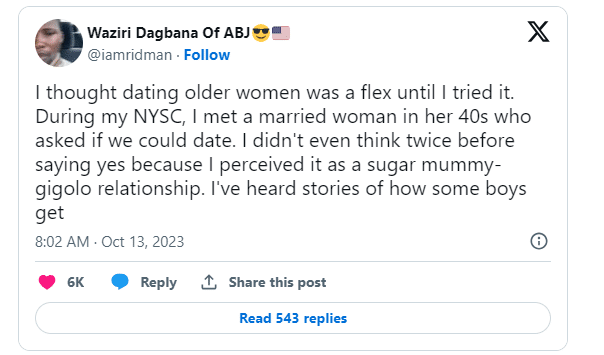 “I’ve heard stories of how some boys get taken care of by older women, so I was all in, besides I needed some connection to get a job asap after NYSC,” @ the ex-corper post read in part.