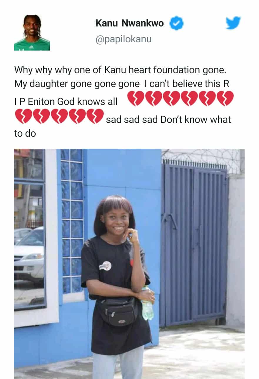“Why why why one of Kanu heart foundation gone. My daughter gone gone gone I can’t believe this R I P Eniton God knows all sad sad sad Don’t know what to do”, the 43-year-old former star tweeted.