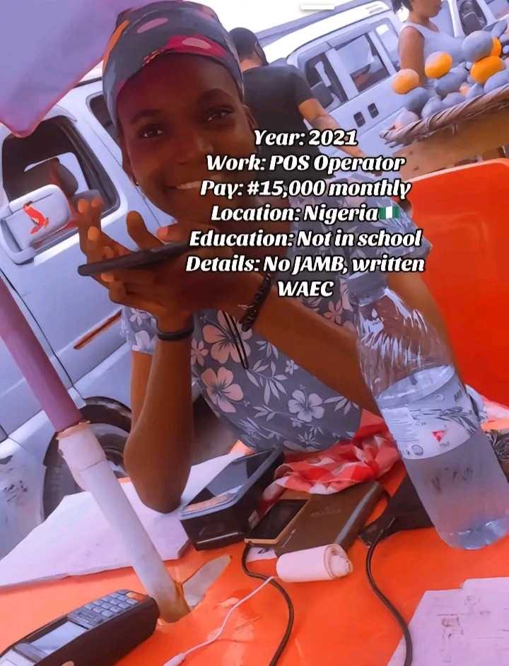The first photo shows her in 2021 when she was a POS operator earning N15K, out of school with no exams for tertiary education written.
