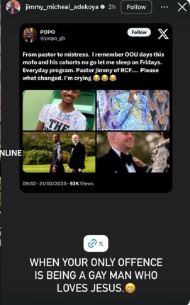 Former RCF president at OOU, Jimmy Adekoya, reacts after being criticized for marrying a man.