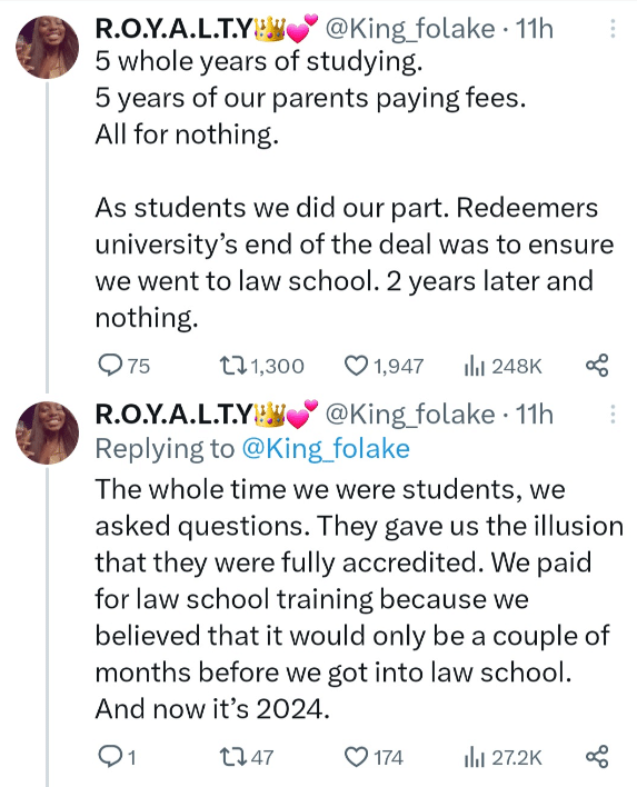 An ex-student of Redeemer’s University has taken to social media to voice her frustration and disappointment over the institution’s alleged failure to secure accreditation for its law program.