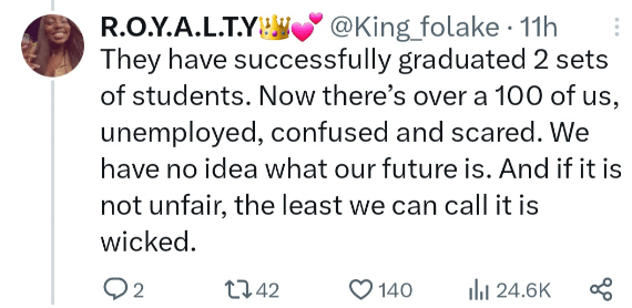 According to the lady, this has left a lot of them in a state of uncertainty and frustration, as they are unable to utilize their degrees as intended.