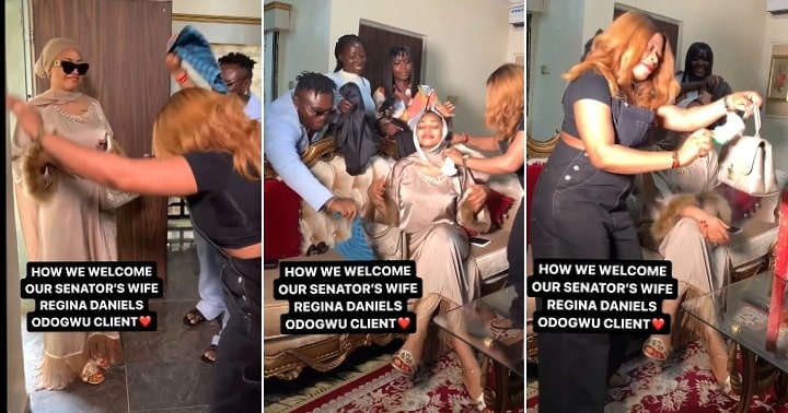 Sharing the video via Instagram, the makeup artist said: “How we welcome our senator’s wife Regina Daniels. Odogwu client.”