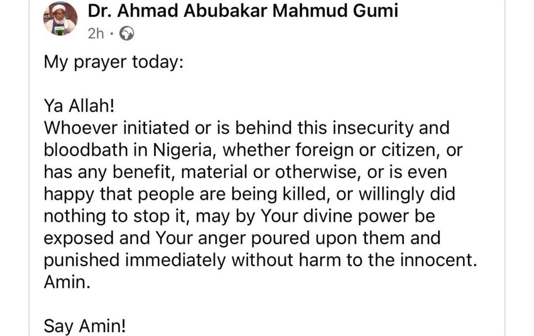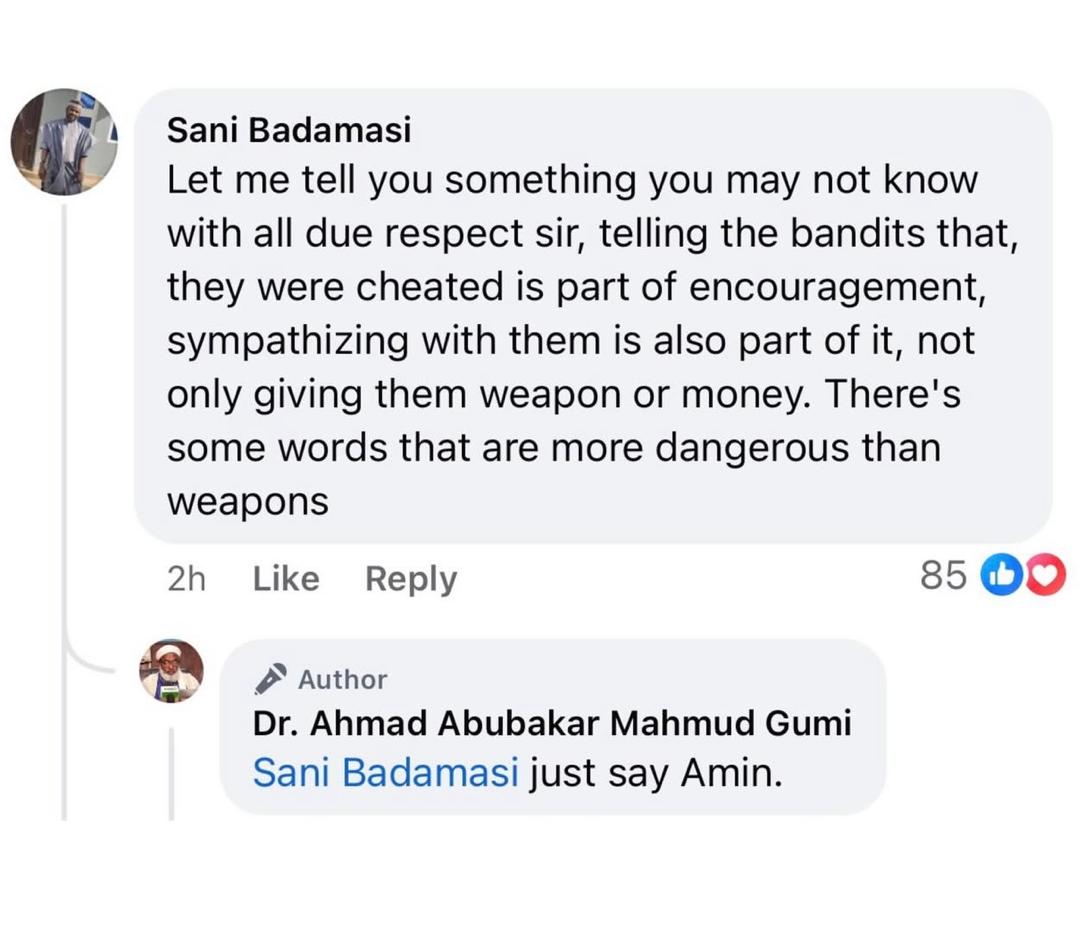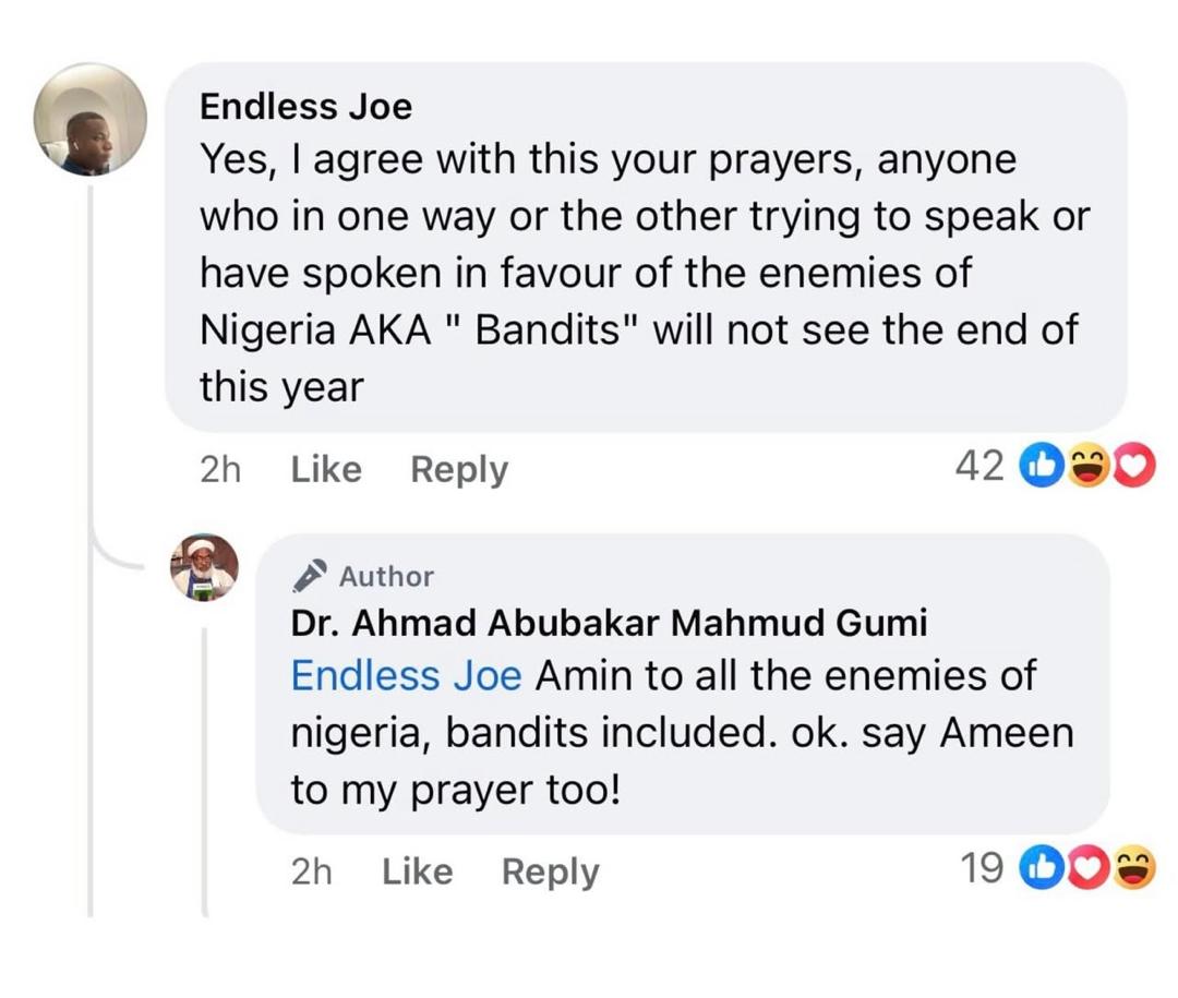 One commenter wrote, “Anyone who in one way or another supported the enemies of Nigeria, aka ‘Bandits,’ will not see the end of this year.” Sheikh Gumi responded, “Amin to all the enemies of Nigeria, bandits included. Ok. Say Ameen to my prayer too!”