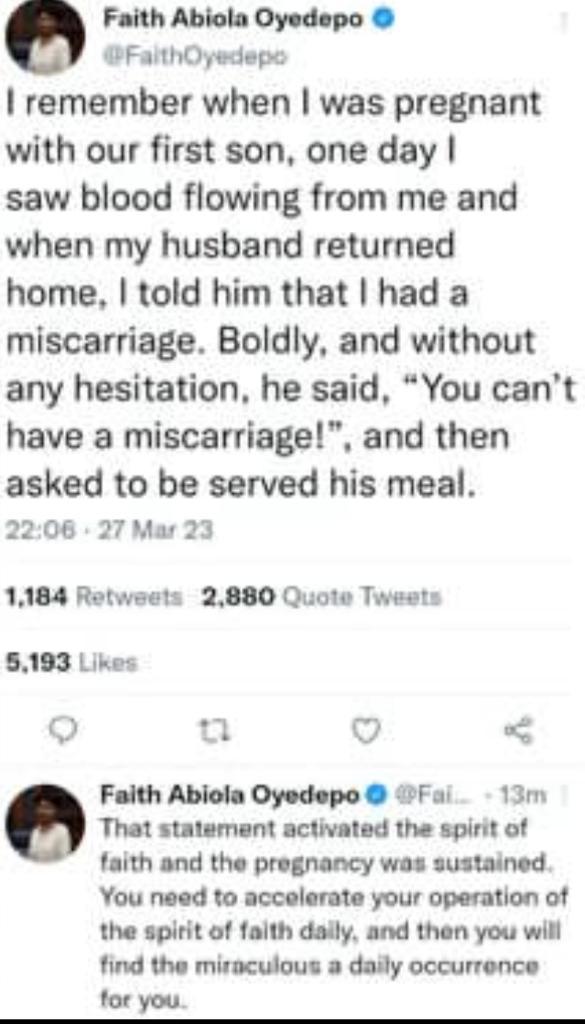 Faith Oyedepo revealed that the “statement activated the spirit of faith and the pregnancy was sustained”.