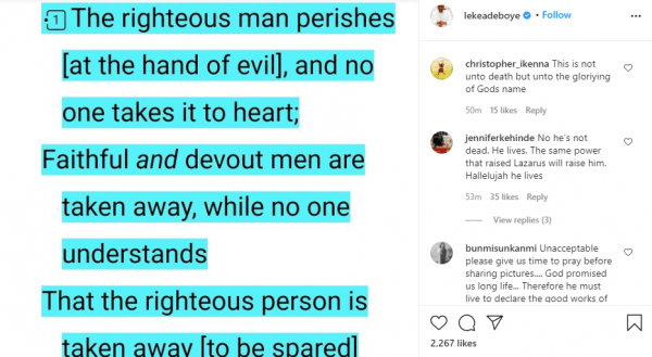 He added a scripture verse from the bible on the death of the righteous that reads: