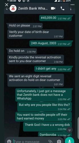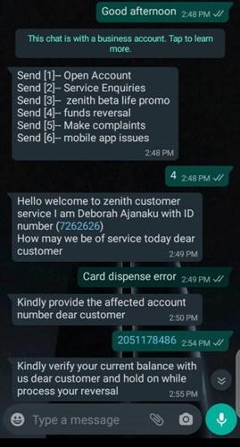 She had shown receipts of how she reached out to the Zenith Bank PLC for reversal of funds via WhatsApp. Unknown to her, the man behind the account is a fake.