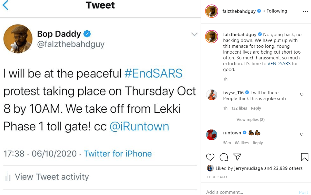 Nigerian singer, Folarin Falana popularly known as Falz, has revealed he would be joining Runtown on the #EndSARS protest taking place on Thursday, October 6th, in Lagos.