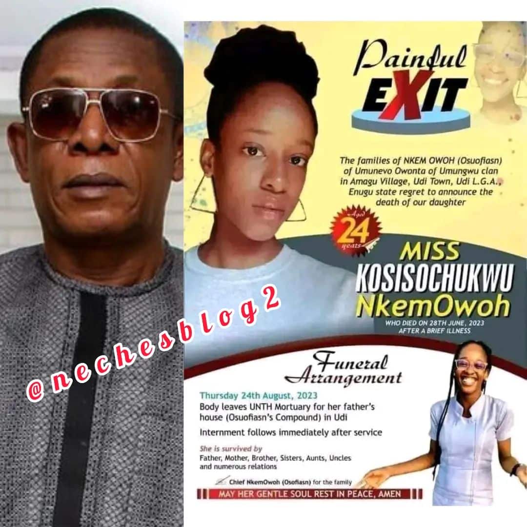 Veteran of Nollywood Nkem Owoh a.k.a Osuofia announces the burial of his daughter Kosisochukwu who died on June 28 after a brief illness.