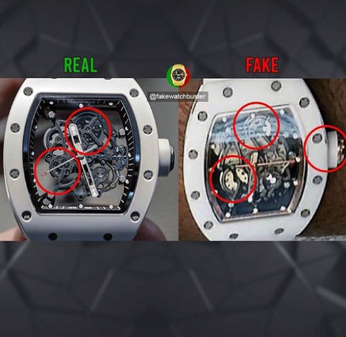 According to FakeWatchBuster, the fake watch has a different skeleton mechanism, its bezel shape is thicker than the original, has wrong dialing proportions, screws have different sizes and a wrong crown shape.