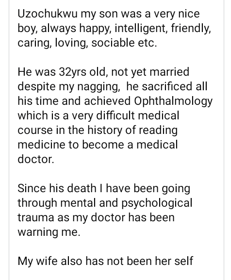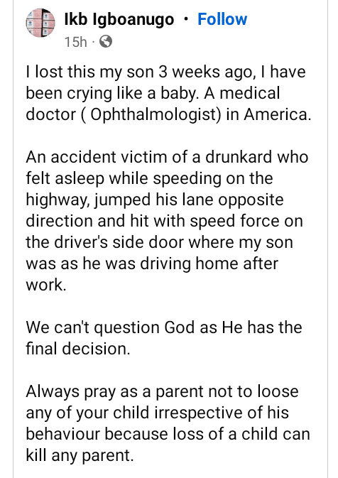 “I lost my son 3 weeks ago, I have been crying like a baby. A medical doctor ( Ophthalmologist) in America