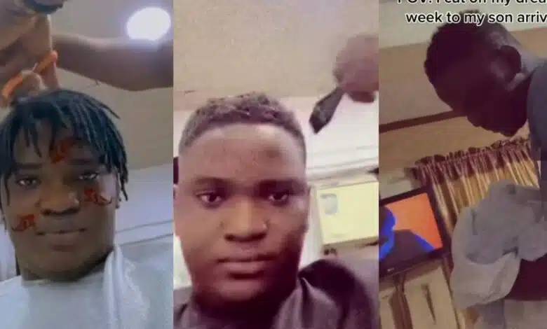“Father figure activated” – Netizens commend man as he shaves off his dreadlocks for arrival of his son (Video)