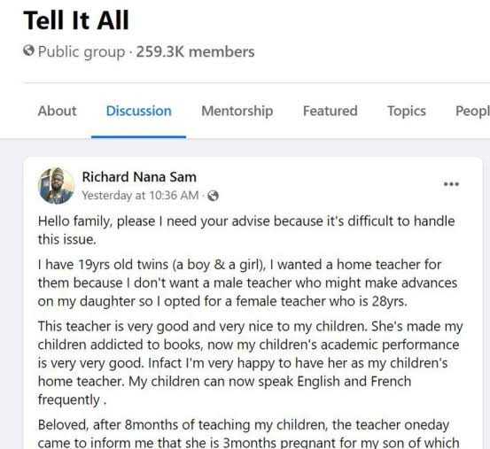 He shared his experience hiring a home tutor for his twins (a boy and a girl) who are both 19 yrs on the Facebook group “Tell It All”.