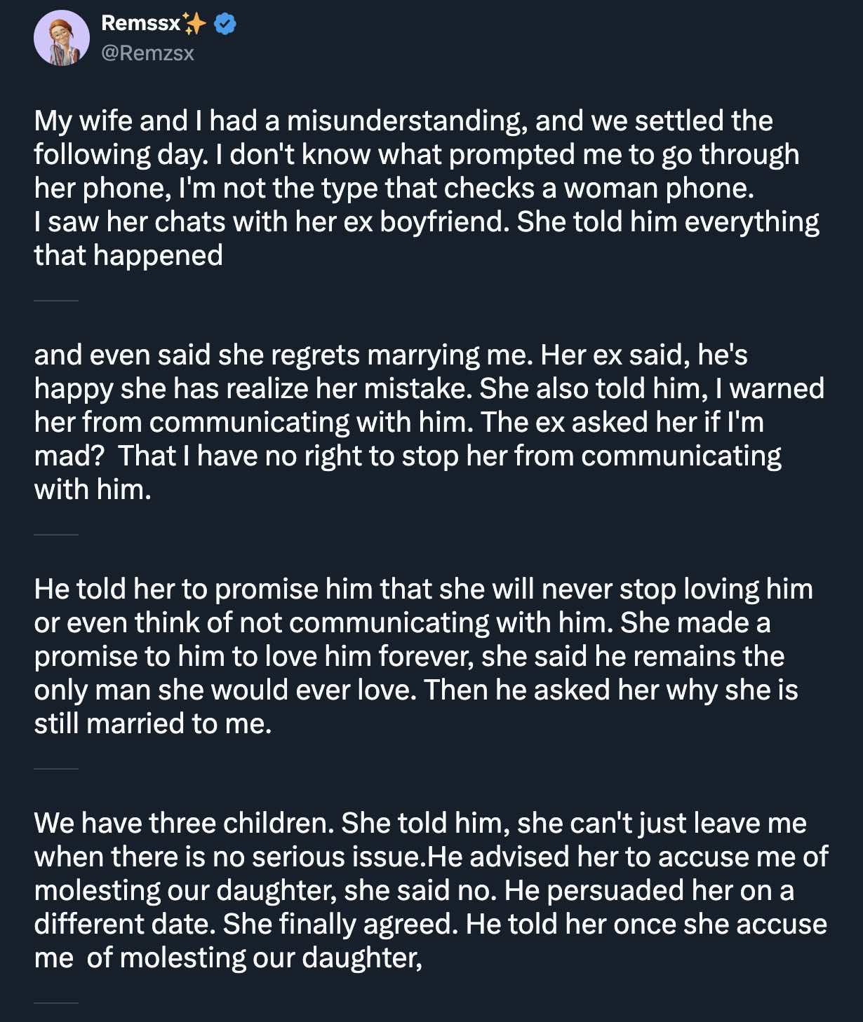 In a narration by a relationship adviser identified as @Remzsx, the man discovered the incriminating chats but initially remained silent.