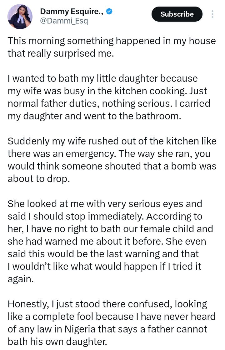 Confused, the father questioned the reasoning behind the restriction. “Honestly, I just stood there confused, looking like a complete fool because I have never heard of any law in Nigeria that says a father cannot bath his own daughter. Now I’m really wondering… is there actually any rule or cultural belief that says a father shouldn’t bath his daughter? Or is this just something some families believe in?”