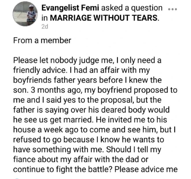 A lady has narrated how her boyfriend’s father stopped his son from getting married to her, because they had an affair years ago.
