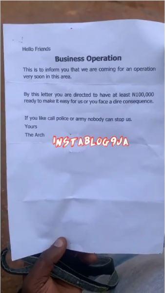 In the letter, the robbers advised them to set aside a sum of 100 thousand naira (at least) before their arrival in order to facilitate a seamless operation and promised to unleash their wrath on them if they fail to do so.