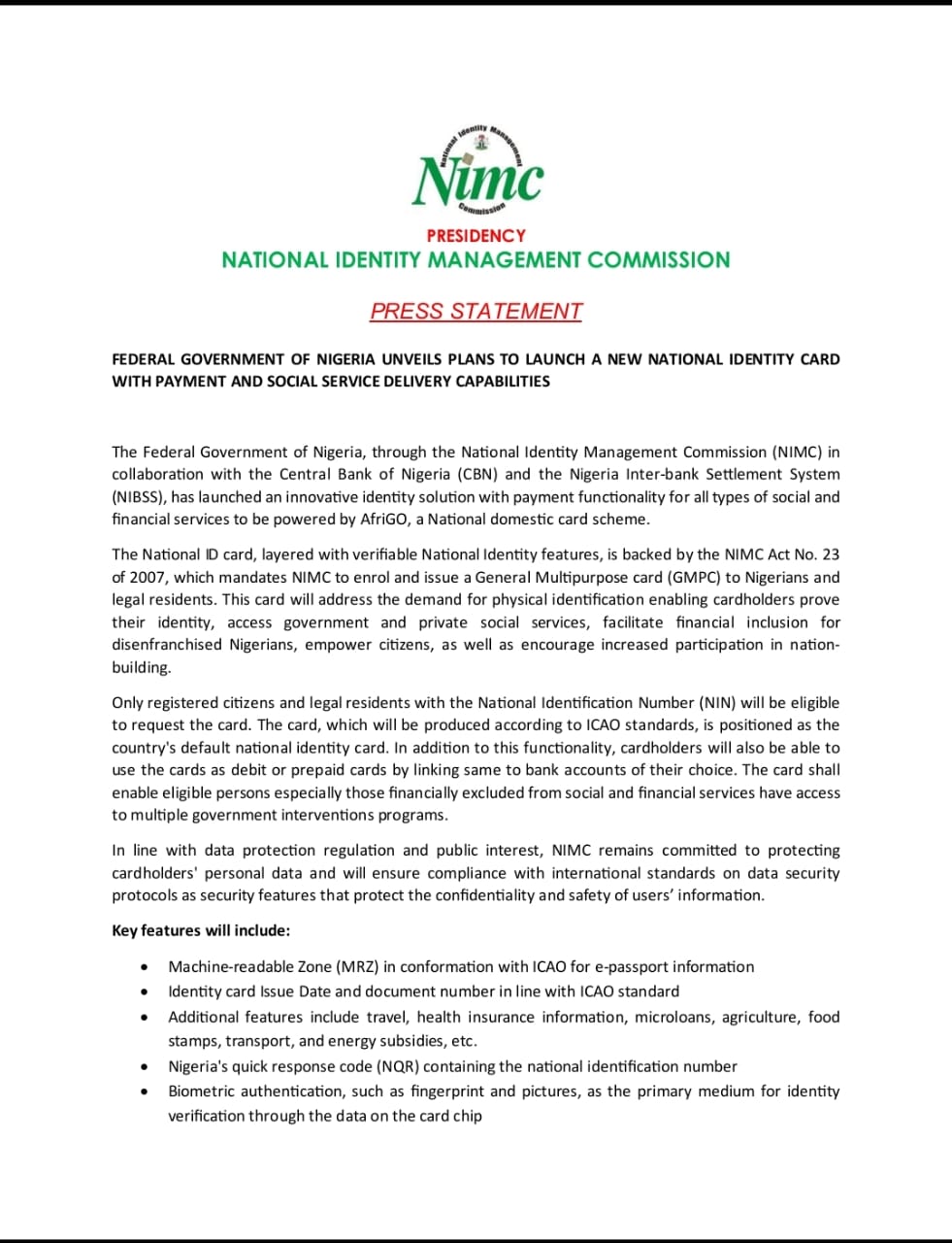 The Federal Government of Nigeria, in collaboration with the National Identity Management Commission (NIMC), Central Bank of Nigeria (CBN), and Nigeria Inter-bank Settlement System (NIBSS), is introducing a new national ID card with payment and social service delivery capabilities.