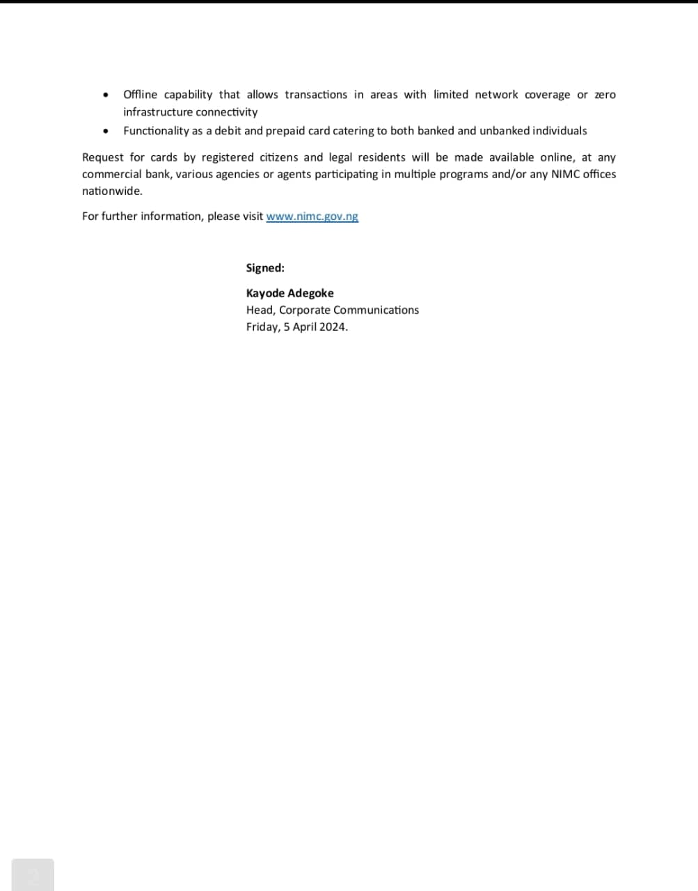 The card, backed by the NIMC Act No. 23 of 2007, will provide verifiable national identity features and enable access to government and private services, promote financial inclusion, and empower citizens.