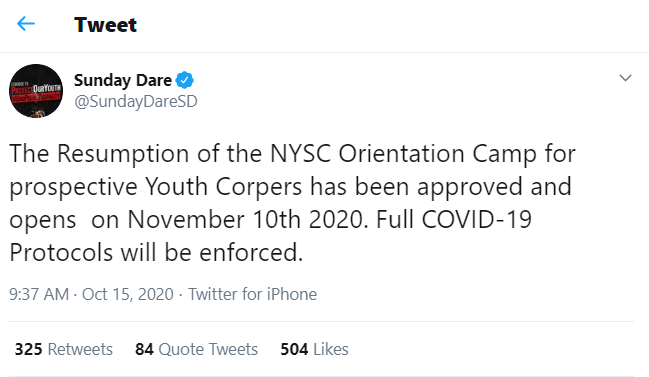 He tweeted, “The Resumption of the NYSC Orientation Camp for prospective Youth Corpers has been approved and opens on November 10th 2020. Full COVID-19 Protocols will be enforced.”
