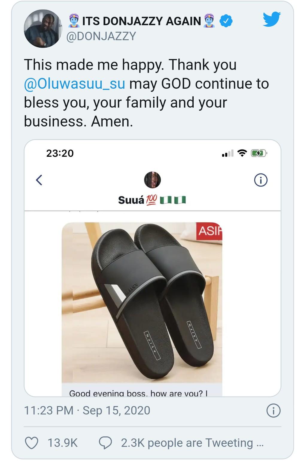 Taking to his Twitter page to appreciate the fan, Don Jazzy wrote; This made me happy. Thank you @Oluwasuu_su .may GOD continue to bless you, your family and your business. Amen.