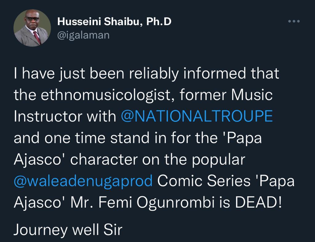 ”I have just been reliably informed that the new ethnomusicologist, former Music Instructor with @NATIONALTROUPE and one time stand in for the ‘Papa Ajasco’ character on the popular @waleadenugaprod Comic Series ‘Papa Ajasco’ Mr. Femi Ogunrombi is DEAD!