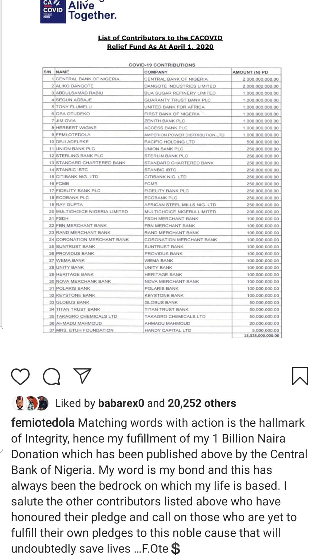 Matching words with action is the hallmark of Integrity, hence my fufillment of my 1 Billion Naira Donation which has been published above by the Central Bank of Nigeria. My word is my bond and this has always been the bedrock on which my life is based. I salute the other contributors listed above who have honoured their pledge and call on those who are yet to fulfill their own pledges to this noble cause that will undoubtedly save lives …F.Ote”