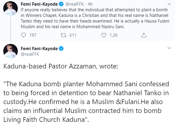 Former Aviation Minister, Femi Fani-Kayode, while reacting to the police statement, said anyone who believes that the suspect’s real name is Nathaniel Samuel, would need to have his or her head examined.