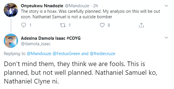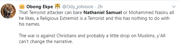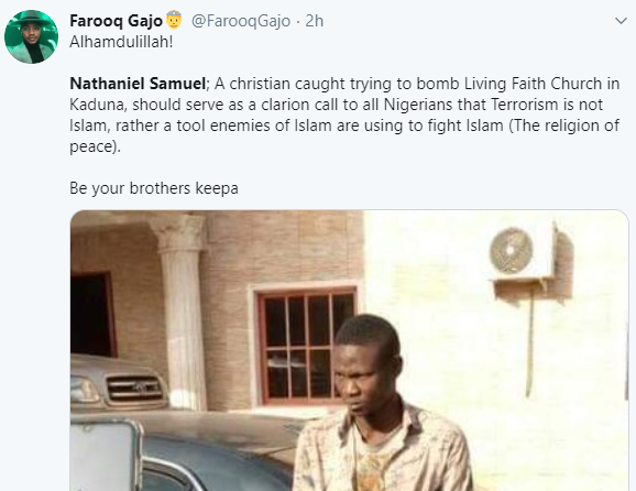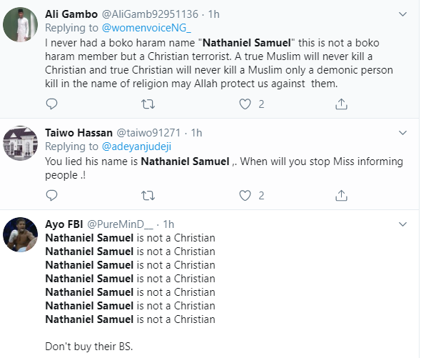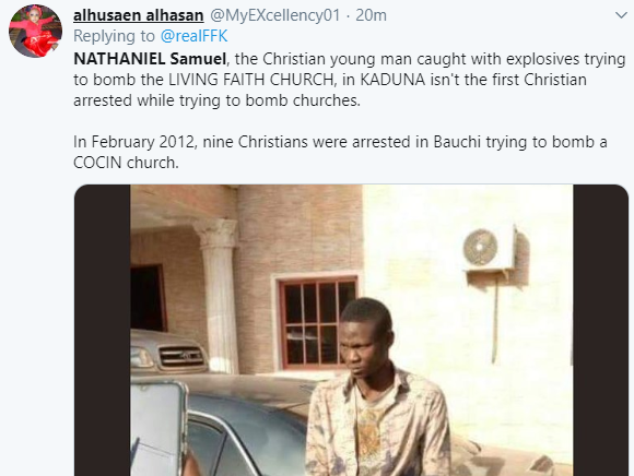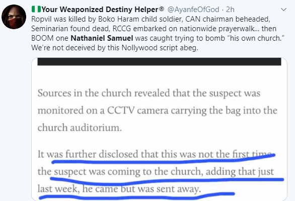 An arguement has ensued on Twitter as some Nigerians claim this is a pseudo name as no ”Christian would attempt to bomb a church.”