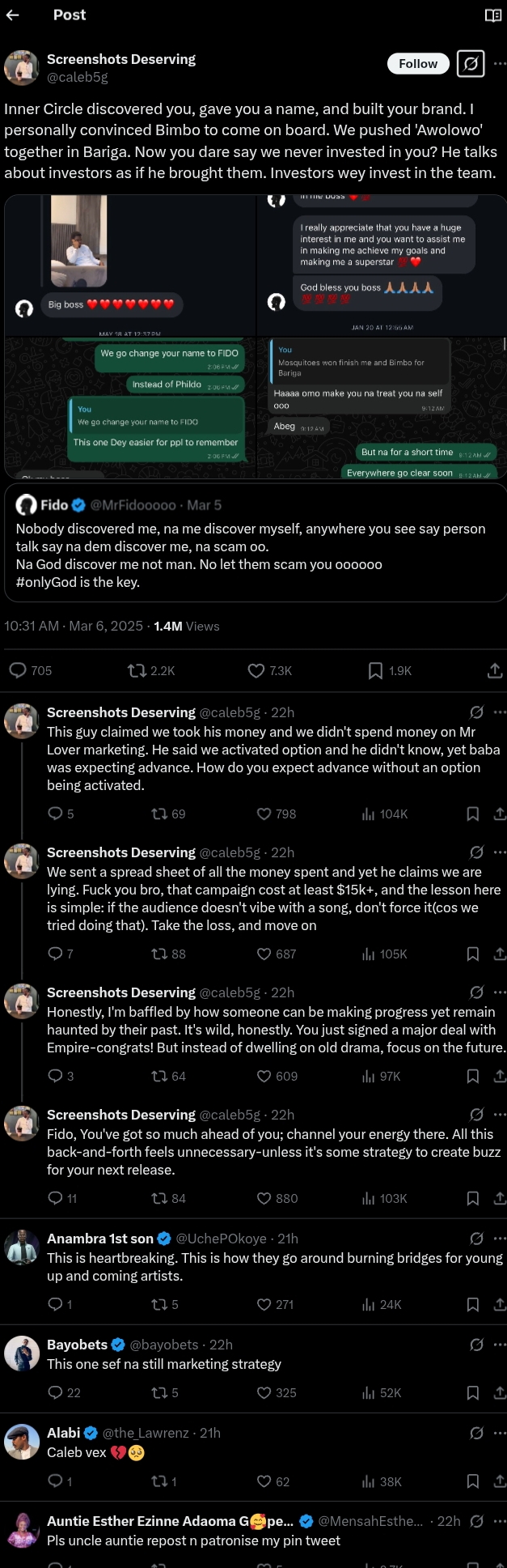 An individual, who appeared to have been closely involved in Fido’s rise, shared detailed receipts, revealing those who allegedly discovered and nurtured the singer.