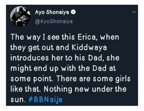 In his words…. “The way I see this Erica, when they get out and Kiddwaya introduces her to his dad, she might end up with the dad at some point. There are some girls like that. Nothing new under the sun.”