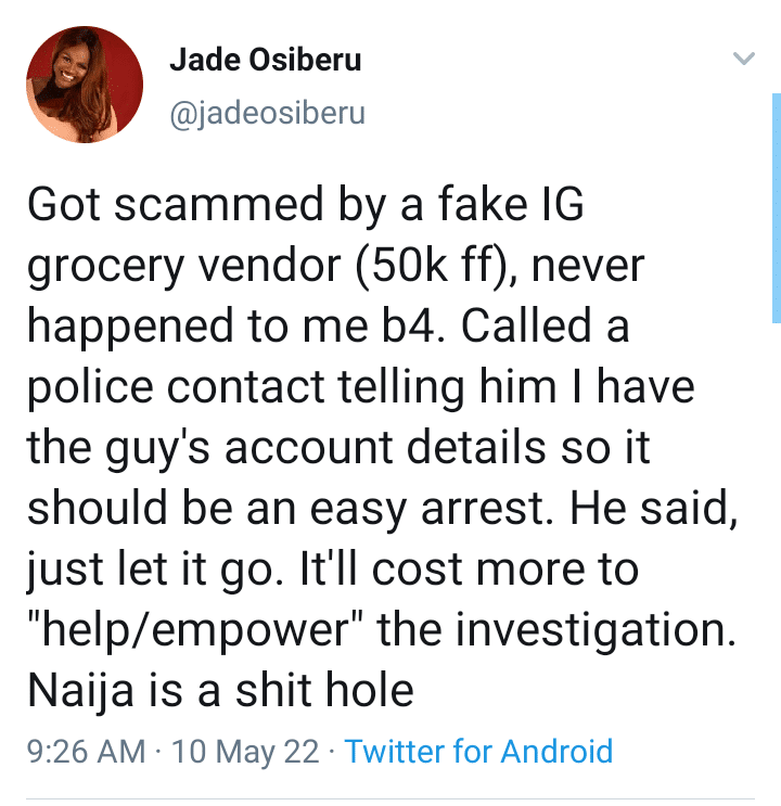 Recounting the experience on Twitter, she wrote: “Got scammed by a fake IG grocery vendor (50k ff), never happened to me b4. Called a police contact telling him have the guy’s account details so it should be an easy arrest. He said, just let it go. It’ll cost more to “help/empower” the investigation. Naija is a shit hole.”