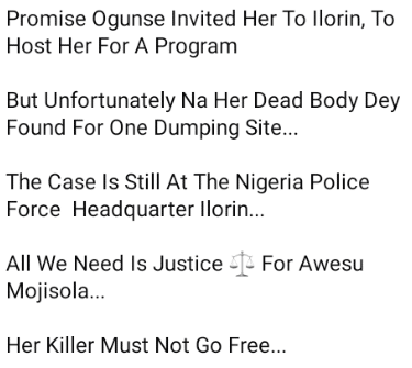 Shortly after this communication, Mojisola’s phone was switched off, and all efforts by her roommate to reach her proved futile.