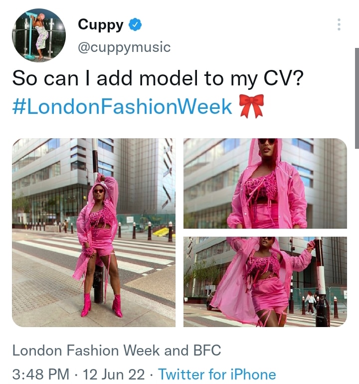Cuppy had uploaded some images of herself elegantly dressed and asked whether she should add model to her curriculum vitae.