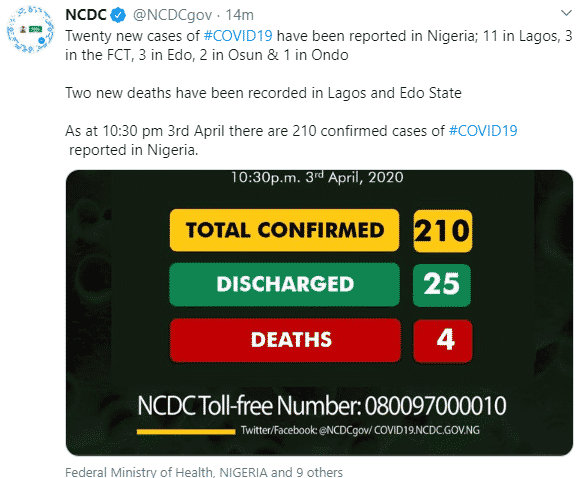 “Two new deaths have been recorded in Lagos and Edo State. As at 10:30 pm 3rd April there are 210 confirmed cases of #COVID19 reported in Nigeria.”