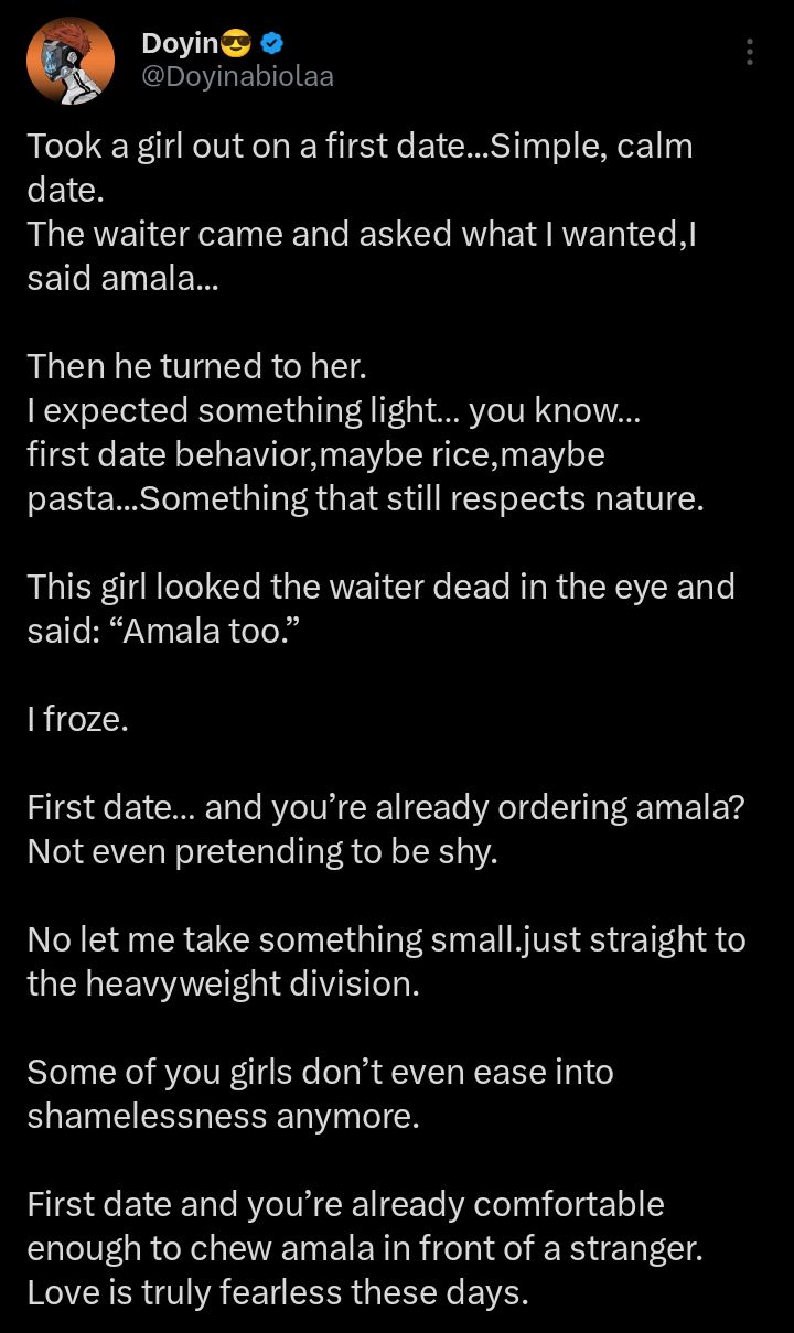 According to the man, he had expected a light meal for the first date. “The waiter came and asked what I wanted. I said amala,” he recounted. He then turned to his date, expecting something modest or conventional, maybe rice or pasta.