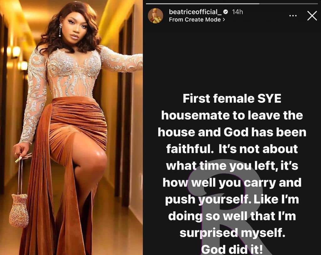 “First female SYE housemate to leave the house and I’m doing so well” – Beatrice
