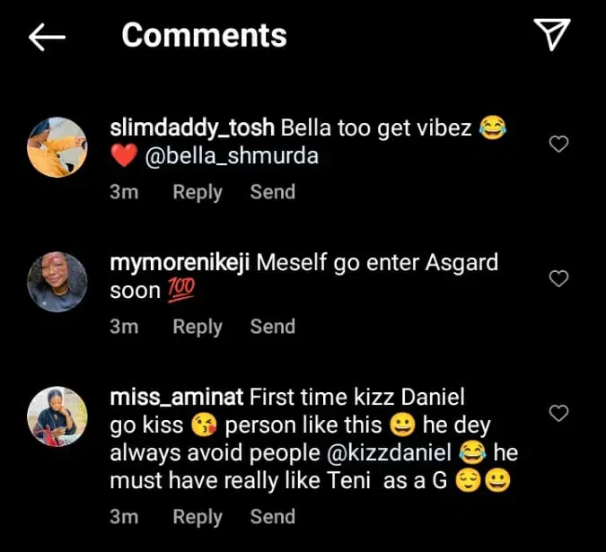 Reacting to the post, @miss_aminat wrote: “First time kizz Daniel go kiss😘 person like this 😊 he dey always avoid people @kizzdaniel 😂 he must have really like Teni as a G 😌😄.”