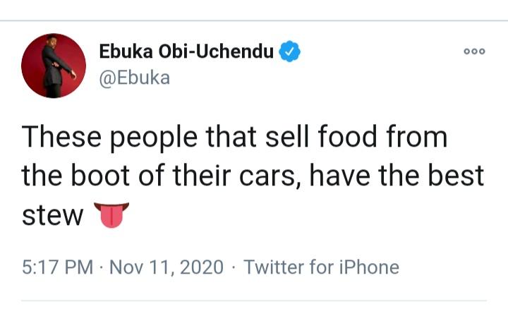 Popular TV host, Ebuka Obi-Uchendu, has opined that vendors selling from the boot of their cars make the best tasteful meals.