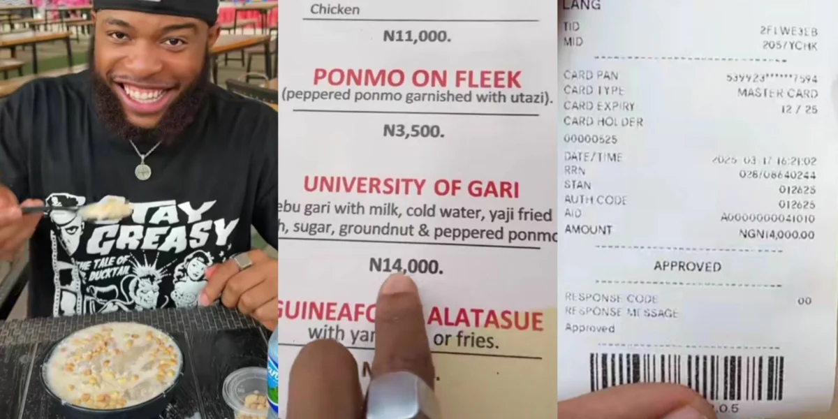 A food influencer stirs reactions as he shows off garri he bought for N14K at a restaurant.