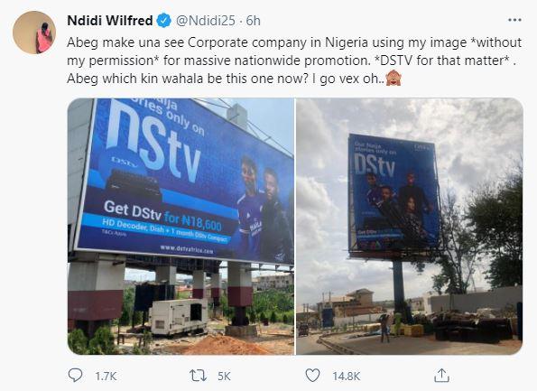 “Abeg make una see Corporate company in Nigeria using my image *without my permission* for massive nationwide promotion. *DSTV for that matter* . Abeg which kin wahala be this one now? I go vex oh..?”